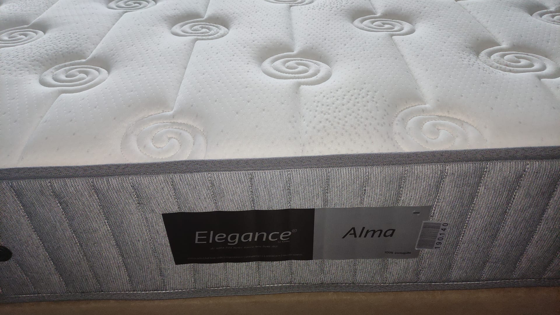 Colchão branco acolchoado com laterais cinzentas e etiquetas Elegance e Alma