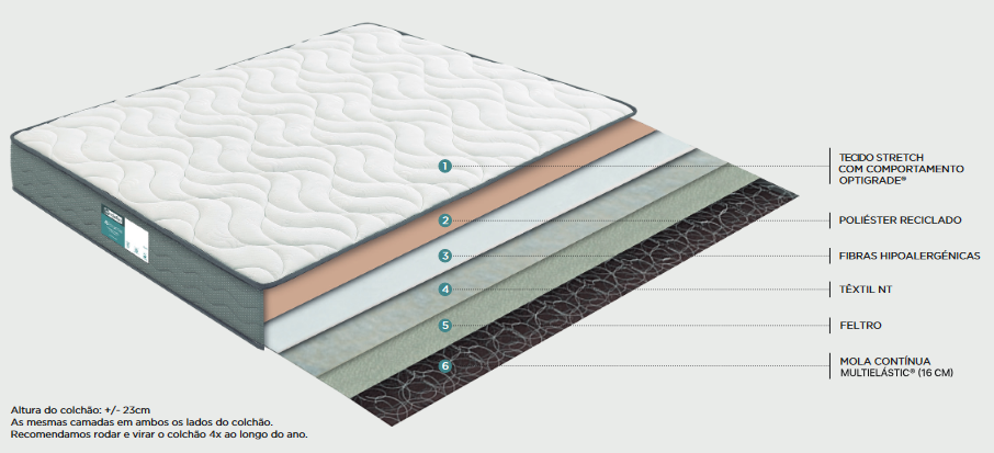 Colchão de conforto firme, graças à Mola Contínua Multielástic®, uma tecnologia exclusiva Molaflex®.