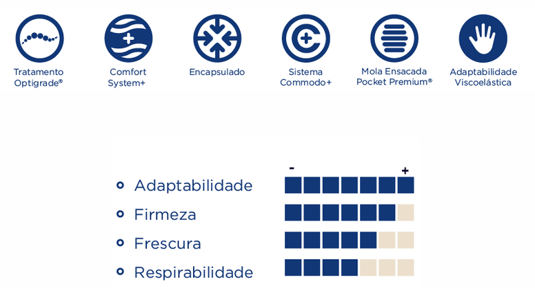 Ícones e texto em português europeu sobre características do produto e gráfico de barras