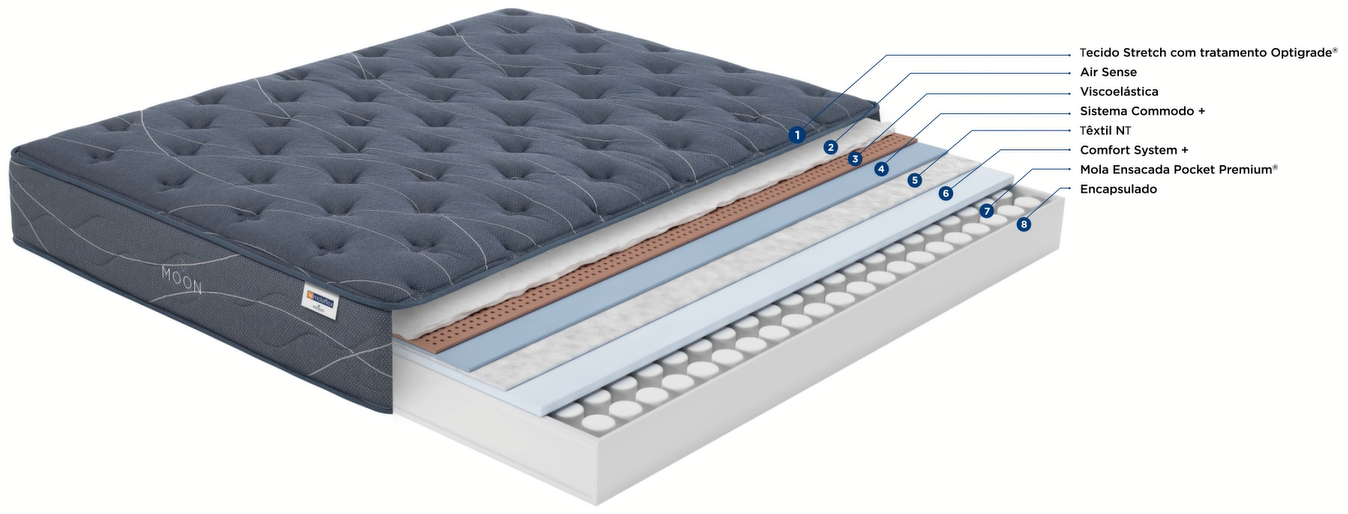 Aliando a Mola Ensacada Pocket Premium® ao Acolchoado Viscoelástica, o MOON oferece zonas de descanso independentes e uma adaptabilidade tão milimétrica quanto astronomicamente suave.
