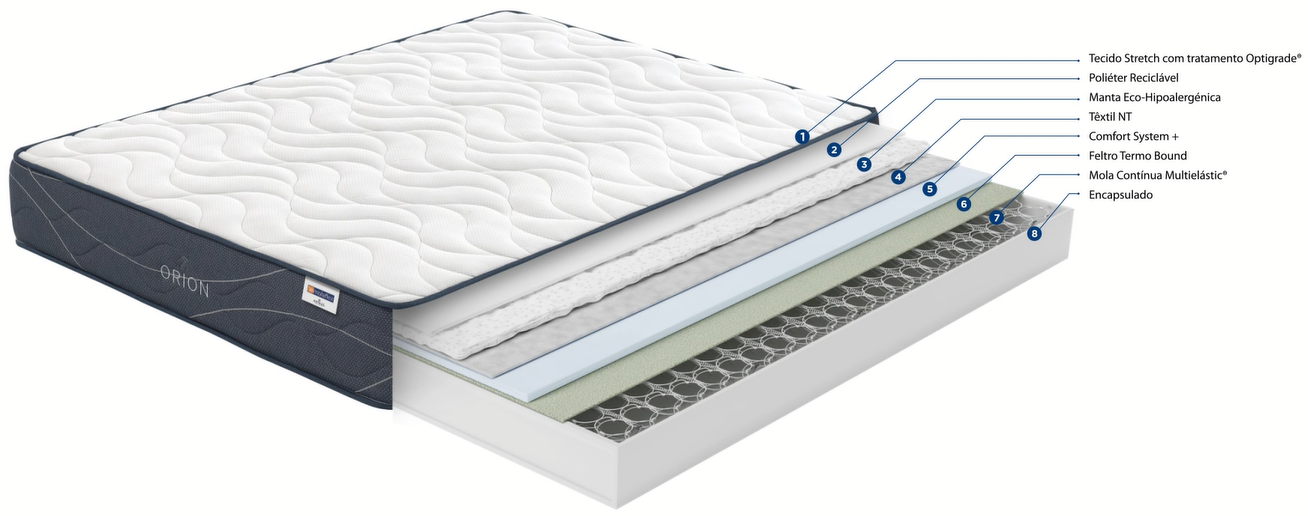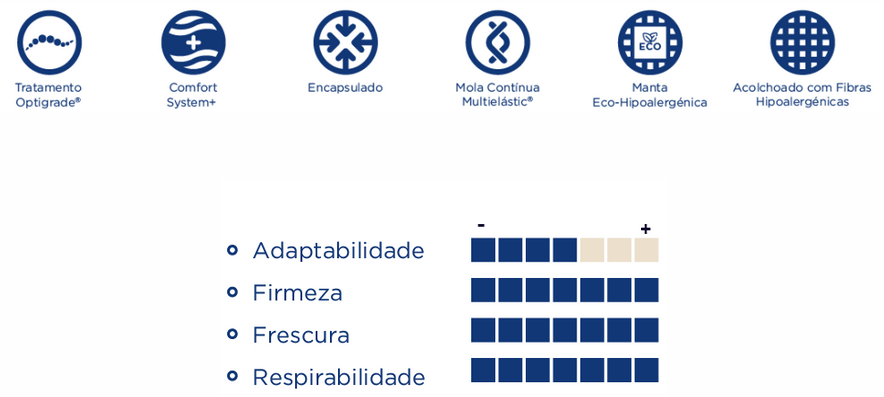 Com um sistema de molas encapsuladas e acolchoado Eco-Hipoalergénico de alta qualidade, este colchão oferece máxima resistência.